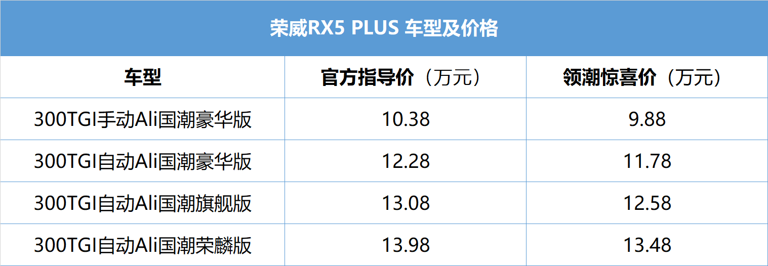 6月10日,荣威RX5 PLUS正式上市,共推出4款车型,官方指导价10.38-13.98万元,全系搭载全新一代“蓝芯”1.5TGI缸内中置直喷涡轮增压发动机。新车顺应消费年轻化时代趋势而来,拥有参数化设计、斑马智能VENUS系统、3大终身权益等人无我有的优势,全方位满足年轻人对高品质出行的所有需求。其中,3大终身权益为终身免费基础流量、终身免费保养、终身原厂质保,配合5000元现金礼、荣威车主0首付换购、5000元首付/36期0利率、至高6000元增换购补贴、2000元升级价值5000元国潮荣麟专享包“5大国潮礼遇”,领潮惊喜价仅9.88-13.48万元,让用户买得省钱、用得省心。