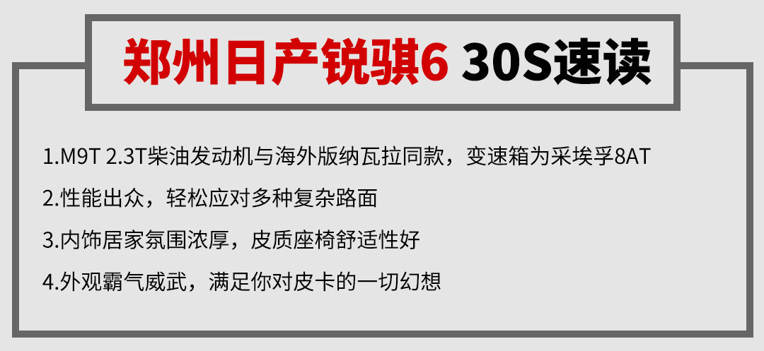 郑州日产锐骐6的定位介于纳瓦拉和新款锐骐之间,是一款关注度颇高的车型。这款车于2018年面市,在皮卡市场取得了不错的反响。此次试驾的车型属于年度改款车型,令人瞩目的就是M9T 2.3T发动机和采埃孚8AT变速箱这套新的动力总成,话不多说,一起来感受一下这款车。