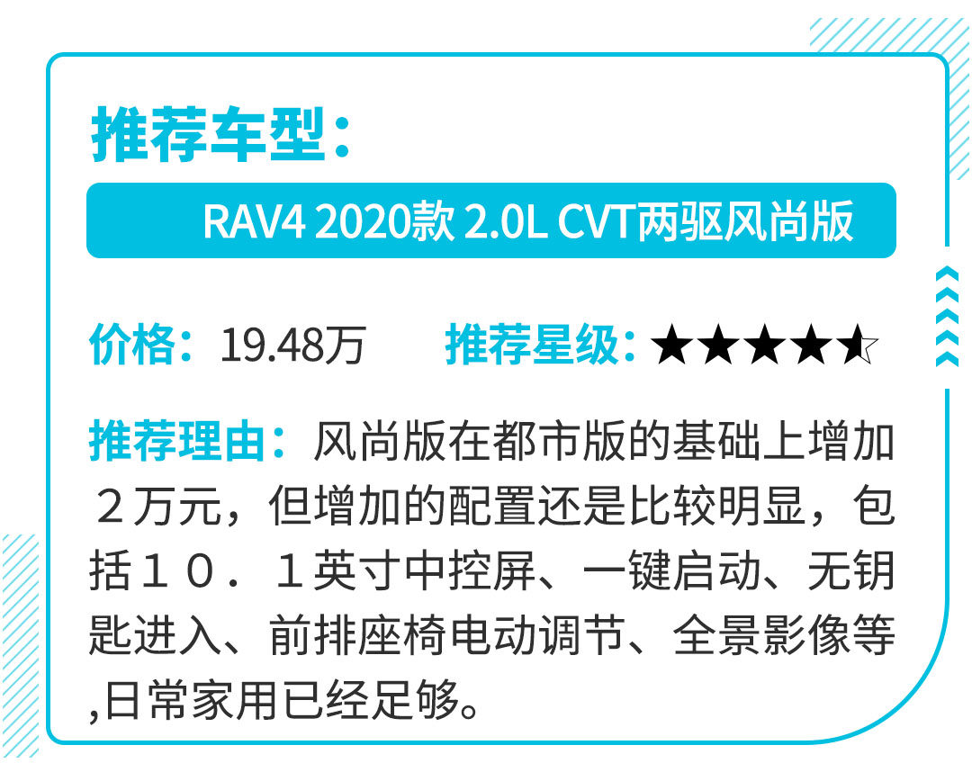 而与同级车型相比,RAV4荣放除了拥有三种不同的四驱系统之外,混动系统也是其一大卖点,不仅动力更强,而且油耗表现不错,车主百公里油耗在6升左右。除此之外,这一代RAV4荣放在安全配置上也比较厚道,全系标配L2级自动驾驶辅助系统和8个安全气囊,这在同级车型中也是很有竞争力的。