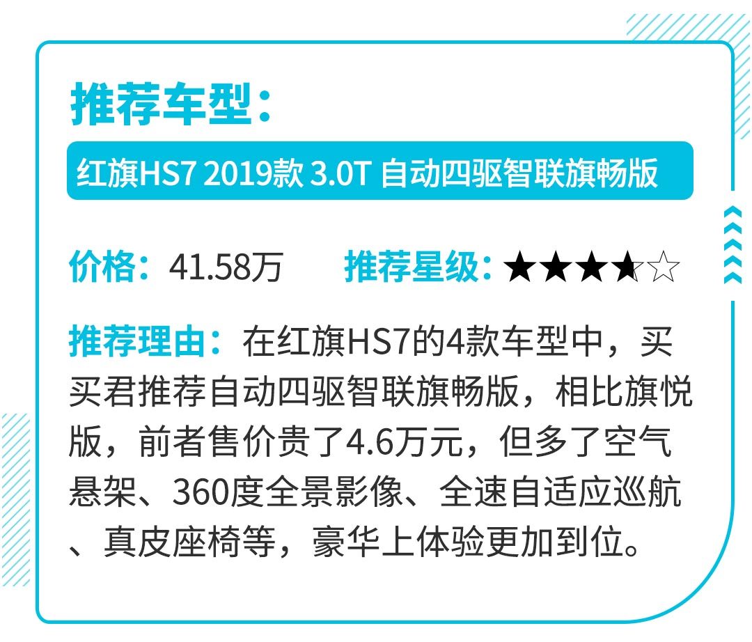 红旗HS7的起步价虽然“只要”34.98万,但带有空气悬架的车型售价去到了41.58万,花40来万,可选择的豪华车型太多,奥迪Q5L、奔驰GLC、沃尔沃XC60、凯迪拉克XT5都在这一价格区间。在品牌影响力和动力匹配上,红旗还差些意思,但HS7胜在车身尺寸和配置用料上,并且全系标配3.0T V6发动机。而与同级的奥迪Q7、奔驰GLE相比,红旗HS7在豪华上的体验不比前者差,并且在售价上要亲民不少,对得起国产豪华车的身份。