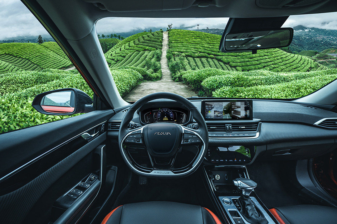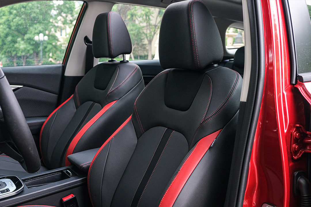 方向盘造型运动,钢琴烤漆和全新的AEOLUS标识搭配,看起来就颇具质感。前排座椅有红色皮革和缝线作为点缀,细节同样不能马虎。