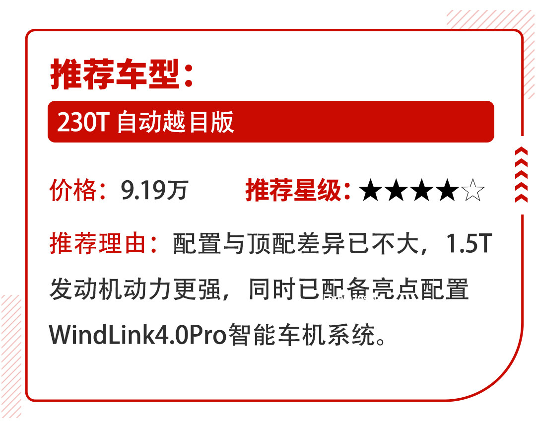 东风风神奕炫GS的起售价在7.49万,这个价格还是很有惊喜的,除了该车在外观及空间方面的设计十分出色以外,入门车型的基础配置也十分够用,10.25英寸高清大屏还搭载Carlife系统已能满足用户的基本需求。在高配车型上,WindLink4.0Pro人工智能车机系统更是锦上添花。下面是教授给出该车型的配置推荐。