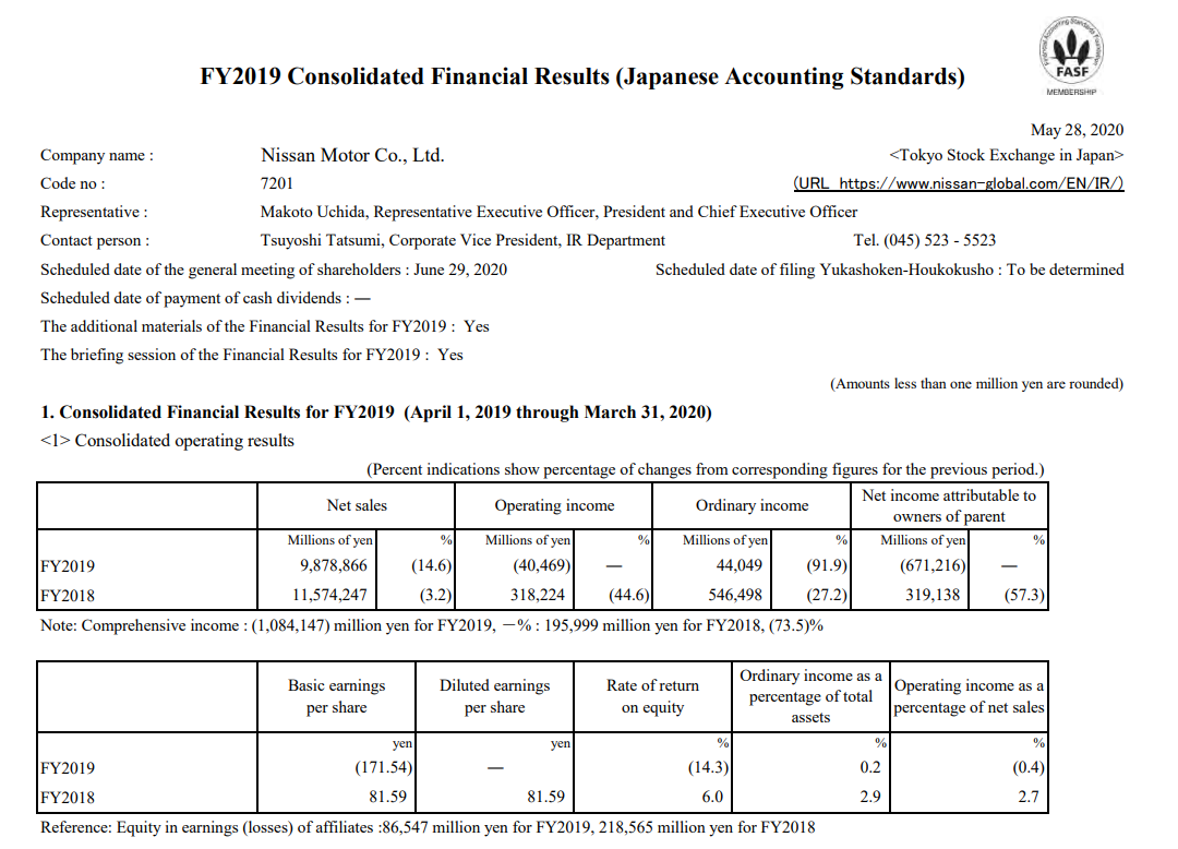 5月28日,日产公布了2019财年(截至2020年3月31日的12个月)的财务业绩,显示净亏损6710亿日元(合62亿美元),为二十年来的最大亏损。并且因疫情带来的不确定性,日产暂不发布本财年的预测,对于2020年的前景同样不容乐观。