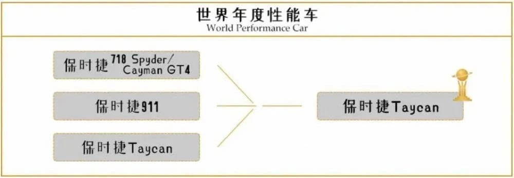保时捷也仅是在2017年夺得冠军,但今年却是包揽了入围名单,保时捷718 Spyder / Cayman GT4、保时捷911以及保时捷Taycan入选最后三强,也预示着冠军已经被保时捷内定了。