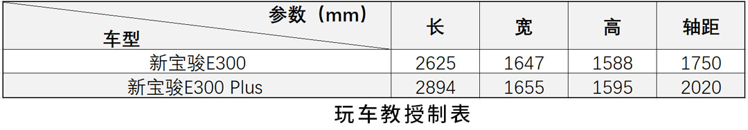 新宝骏E300有2座/3座/4座版车型供消费者选择,其中4座版车型被命名为E300 Plus。车身尺寸方面,新宝骏E300的长宽高为2625mm/1647mm/1588mm,轴距为1750mm;新宝骏E300 Plus的长宽高为2894mm/1655mm/1595mm,轴距为2020mm。