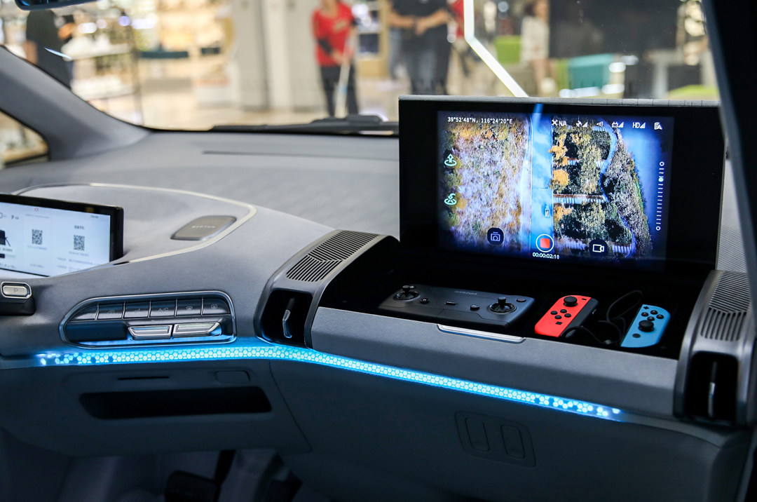 从教授走访店内看到众多IoT设备的布置,并与销售人员交谈后得知,LED落地灯、米家扫地机器人、小米MI摄像机云台,类似的设备都能在驾驶途中在车内直接操控。