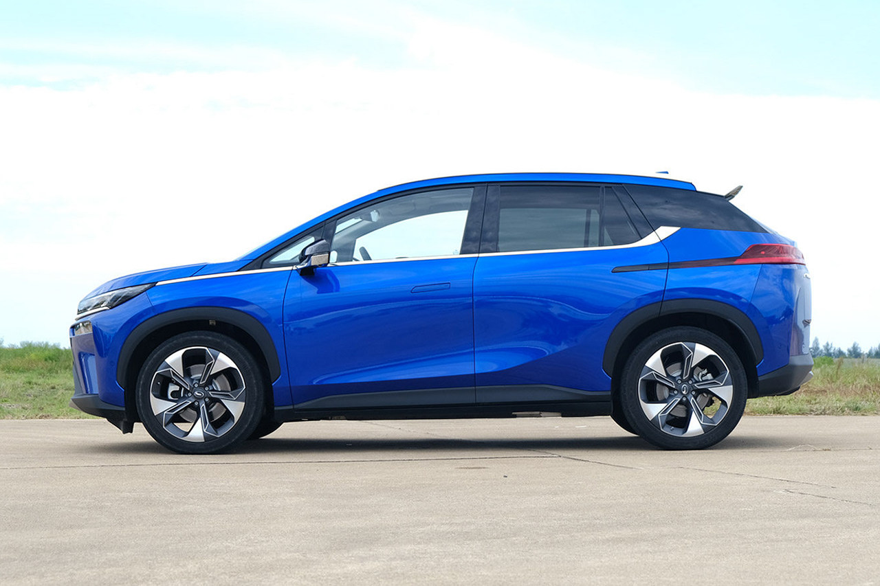 侧面直入眼帘的是悬浮式车顶设计,以及一条颇为高挑的腰线。并且该车还采用了隐藏式门把手的设计,这一许多年前在概念车上才有的设计,如今在量产车上越来越常见了。另外我们可以观察到,埃安V的车轮非常靠近车身四个角,纯电动让车身布局有了更灵活的可能。