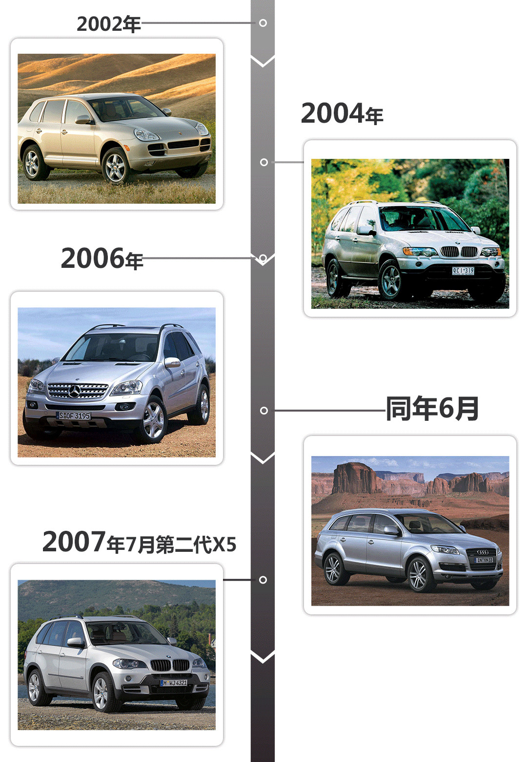 而上文提到的竞品,大多要晚于X5引进。奔驰M级引进已是第二代之后;Q7投放中国市场则是2006年7月,至于卡宴则是最早的,在2002年就引进。