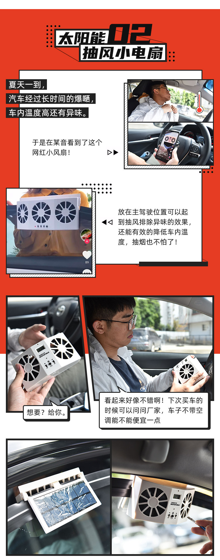 实际上,这款产品还得搭一个升降玻璃胶条来配合使用,太阳能充电速度实在是过慢,用了一段时间就歇菜了。而且风力太小,抽气的速度没什么感觉。最重要的是,装上去之后车窗无法全部关上,有点鸡肋。