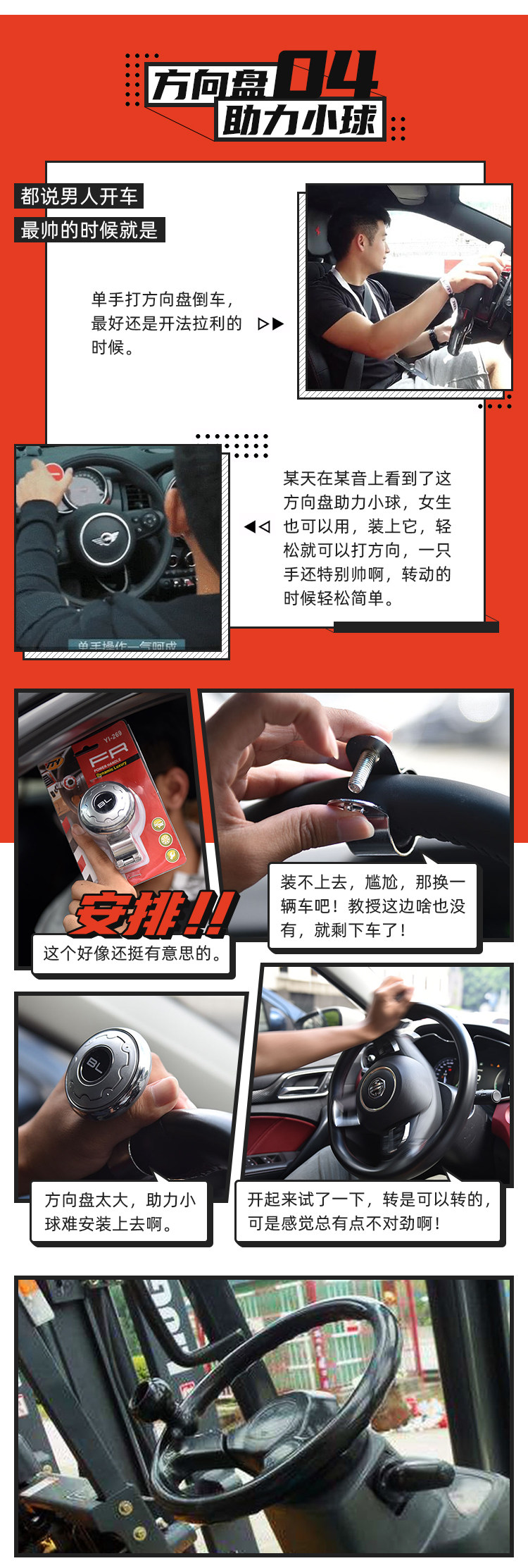 在驾校的时候,教练都教过我们如何正确的打方向,以及转弯的时候如何避免交叉手,这个助力球不仅会改变我们的日常驾驶习惯,操作不慎还会导致方向的失控,单纯为了好玩还是没要什么必要。现在方向盘都是电子助力,不够力气打方向的还是去健身房先练练吧。