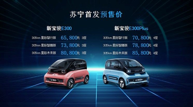 从上汽通用五菱官方获悉,旗下新宝骏E300/E300 PLUS正式公布预售价,新宝骏E300为6.58-8.08万元,共三款车型,座椅布局为3座;新宝骏E300 PLUS为7.08-8.58万元,共三款车型,座椅布局为4座,而未来还将推出2座版本。由于座椅布局的差异,两车在车长和轴距方面均有不同,其中新宝骏E300长为2625mm,轴距为1750mm,新宝骏E300 PLUS长为2894mm,轴距为2020mm。新车定位纯电微型车,本次发布预售价的两个版本NEDC续航里程均为305km,其次该车采用了后置电机后驱的布局,因此前/后悬架分别为麦弗逊式独立和双横臂式独立悬架,而新车上市时间定于6月内。