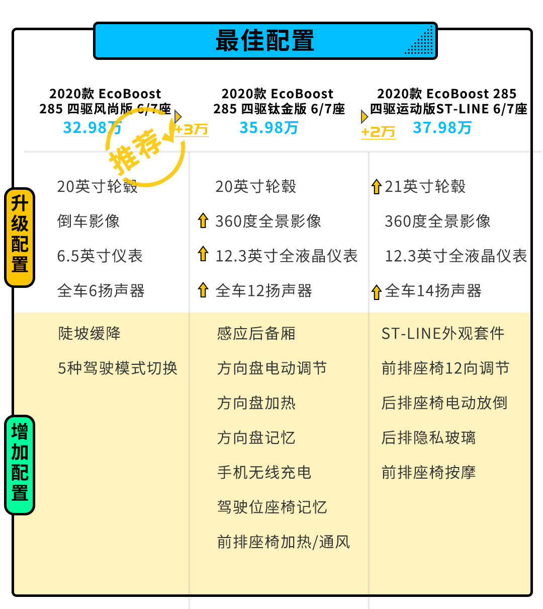 推荐四驱风尚版的主要原因还在于该版本相比入门版车型由后驱升级为了四驱。对于一款重达2吨的SUV,四驱能为车辆带来更好的操控性和稳定性,加上2种驾驶模式的增加为车辆的通过性表现和脱困能力带来一定加分。而像钛金板虽然有比较大车内功能性的提升,但这些也并非不可或缺的功能配置。
