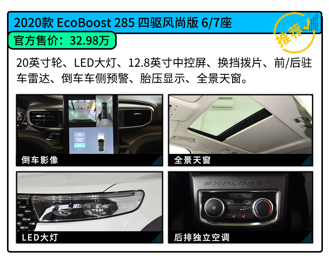 即便是入门版车型,福特探险者也已经拥有了非常不错的配置水准,日常一些常用的功能性和娱乐性配置,以及目前主流的安全配置都已经涵盖其中。因此入门版车型会是非常值得选择的车型版本。