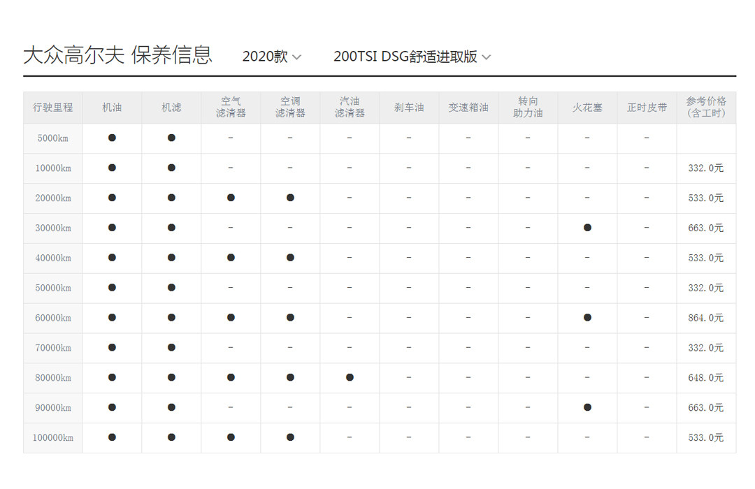 首先我们先来看高尔夫的,按照官方给出的保养建议是1万公里一次保养周期,但首保建议在5000公里。从参考价格上来看高尔夫的保养花销在同级别中算是中规中矩,每3万公里更换一次火花塞的大保养要上到600元以上,而一般的小保养价格在332元。而在工时费上,大部分部件更换都在90元以下,唯独刹车油、变速箱油这两项工时费需要269元和340元。