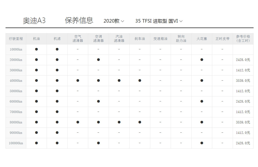 但奥迪A3却能在各方面都给你豪华车的体验,就连保养也不例外,同样是1万公里一保的保养周期,A3更换机油和机滤的小保养花销就能去到1412元,而4万公里的大保养甚至能花费3539元。更换机油需要600元的工时费你敢信?而像比较简单的空滤更换也要120元的工时费,真是打扰了......