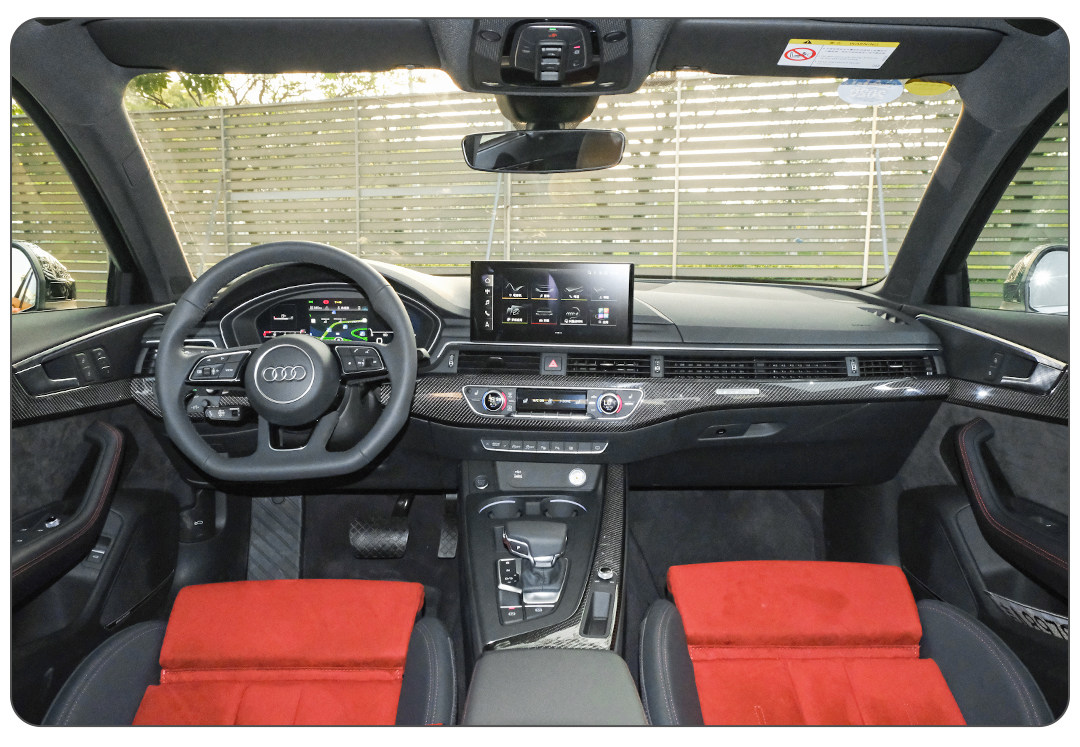 让S4感到困扰的还有A4L臻选动感型的内饰。为了营造运动感,可谓无所不用其极,除了平底方向盘、电子挡把和红黑色运动座椅分外抢眼,大量碳纤维饰板、Alcantara翻毛皮材质以及红色缝纫线的应用都对舱内运动感的提升有莫大帮助。
