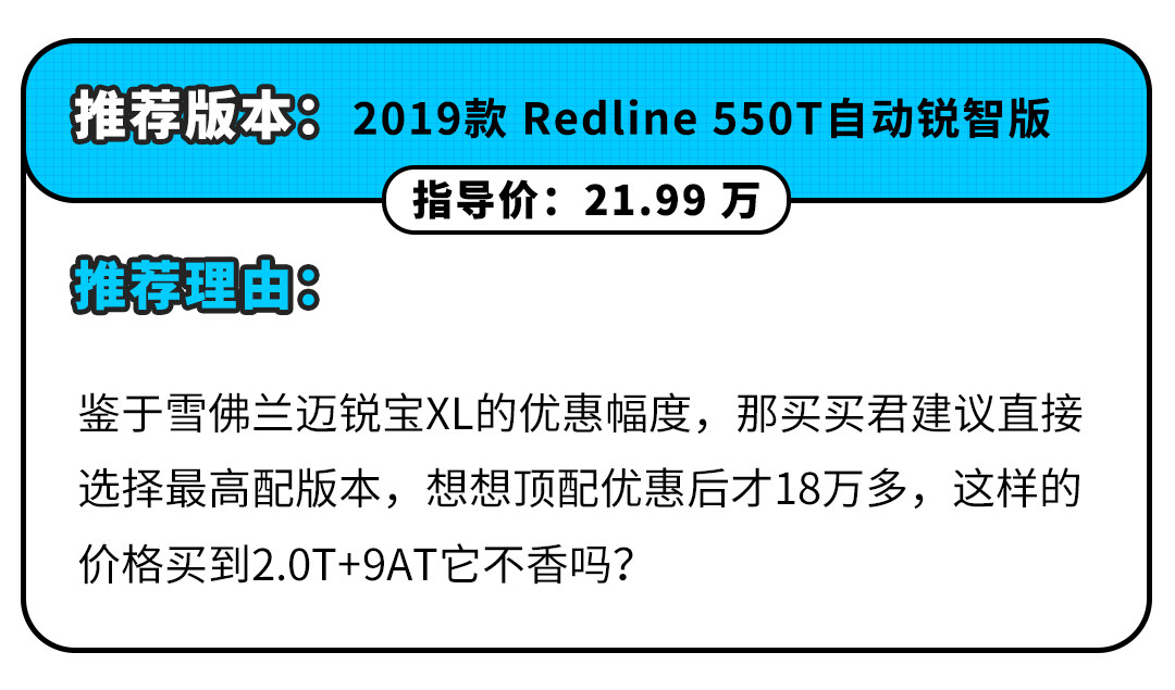 另外迈锐宝XL的价格属于B级车中最低级别梯队,加上雪佛兰销售终端幅度不小的优惠,最顶配的Redline 550T自动锐智版也不过18.49万,想想这样的价格就能拥有凯迪拉克旗舰SUV同款动力组合,这性价比简直是无与伦比的。