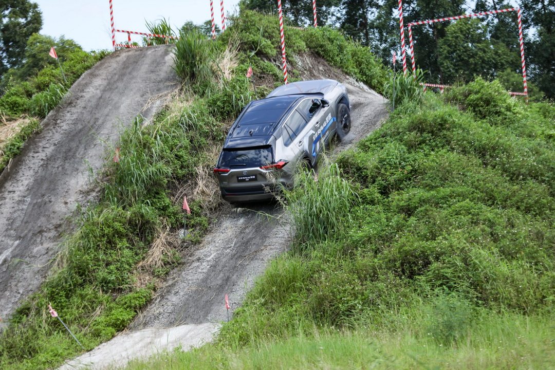 在现场的场地越野试驾中,E-FOUR电动四驱系统响应极快,即便在坡上稍微慢了些,只要深踩油门,车辆立刻能够获得动力,这是比传统四驱系统更好的地方。在现场活动中,35度的坡对RAV4荣放来说毫无压力。
