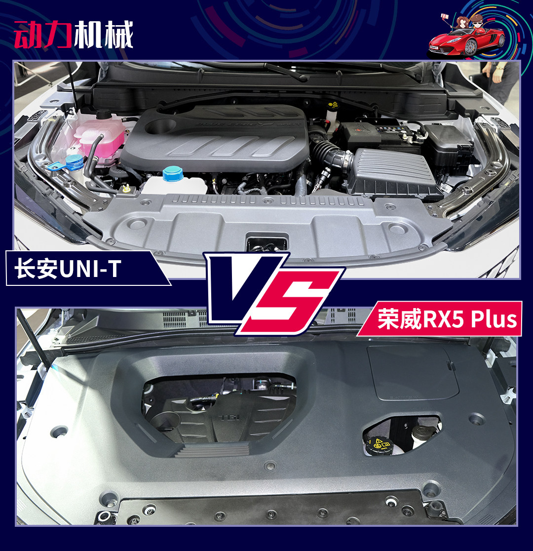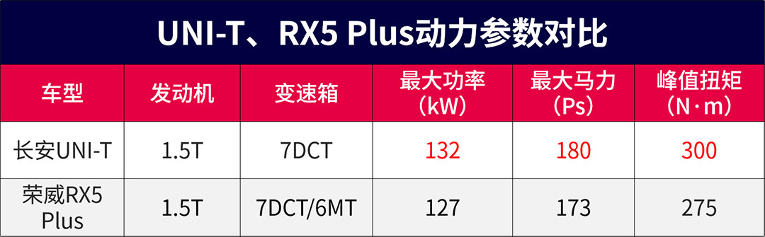 硬核部分,长安UNI-T和荣威RX5 Plus均搭载1.5T引擎,但不同的是前者全系匹配7DCT双离合变速箱,后者低配车型所匹配的是6MT变速箱,而且根据账面数据显示,前者功率、扭矩和马力输出要强上那么一些。