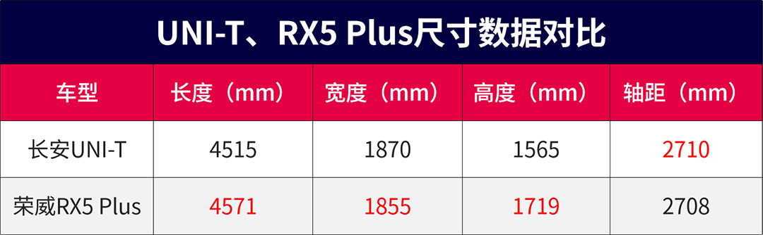 作为紧凑型SUV,长安UNI-T和荣威RX5 Plus的尺寸数据谈不上出色,但也处在主流水准。不过,根据账面数据,RX5 Plus要比UNI-T大上一圈,但轴距要短上2mm。