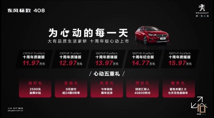 东风标致408十周年版正式上市,新车售价区间为11.97-15.97万元,共有5款车型,该系列车型是为了纪念标致408上市十周年。早在2010年东风标致408在北京上市,这款车型不是当年海外407的延续版本,而是法国标致在国内推出的全球首发车型,截至目前为止,标致408在国内累计销量超过52万辆。而最新上市的十周年车型是基于现款标致408打造,主要变化在于配置调整,同时新车提供的“塞纳红”车身配色为限量发售。动力方面依旧提供1.2T和1.6T两种选择,最大功率分别为136马力和170马力。