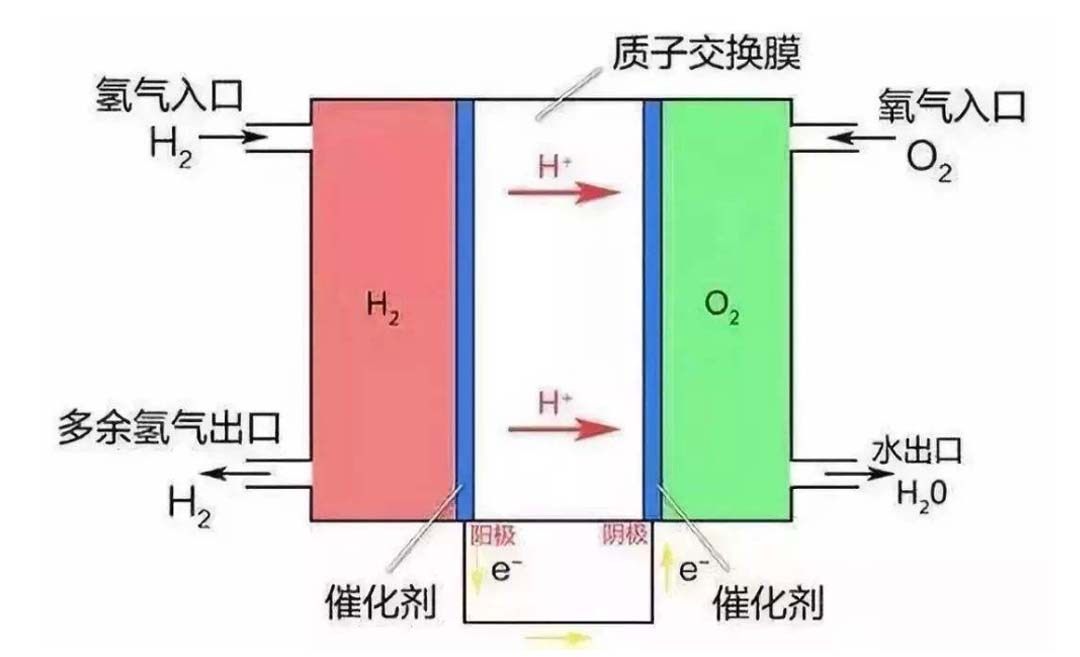 在这样的背景之下,氢燃料电池汽车诞生。氢燃料电池是将氢气和氧气的化学能直接转换成电能的发电装置,其基本原理是电解水的逆反应,把氢和氧分别供给阳极和阴极,氢通过阳极向外扩散和电解质发生反应后,放出电子通过外部的负载到达阴极。