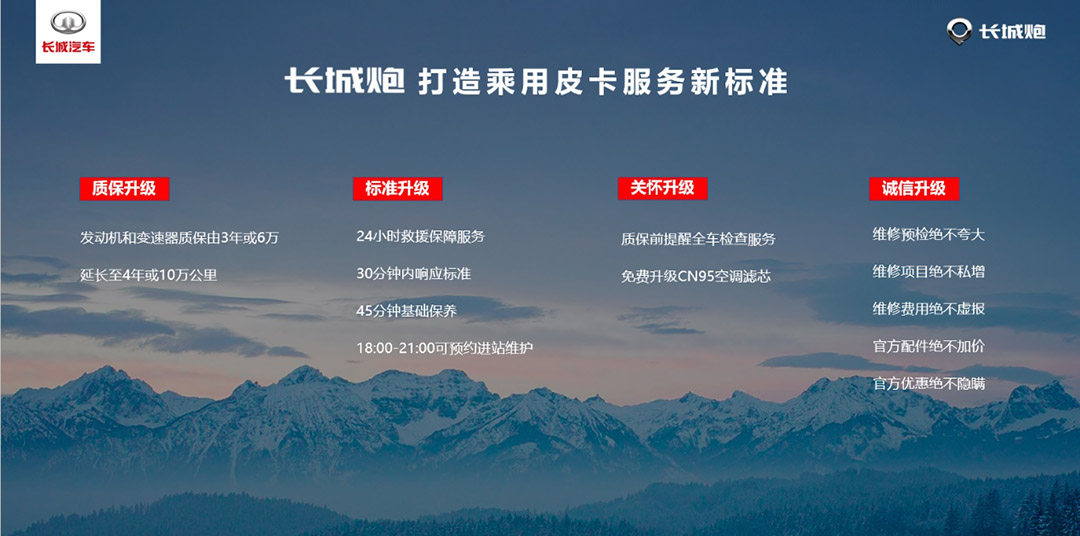 长城炮此次对服务从质保、标准、关怀、诚信4个方面进行了“四维升级”,包括用户可享4年或10万公里的整车质保升级、提升服务响应速度及效率的标准升级、免费更换CN95空调滤芯的关怀升级以及做出五个“绝不”诚信承诺,此次长城炮全面进行服务升级,给用户最贴心的守护,无疑将进一步为长城炮赋能,让长城炮持续巩固在市场中的优势地位。