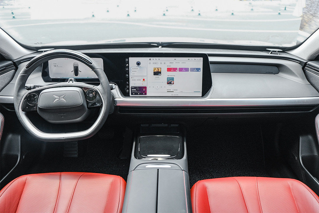 小鹏P7采用对称设计,设计元素非常简洁,但超薄仪表台使得横向视野更加宽广,镀铬饰板和氛围灯的加持拔高了它的内在质感。当然,最吸睛的设计非集合了所有控制功能10.25英寸液晶仪表盘和14.97英寸构成的一体屏幕莫属。