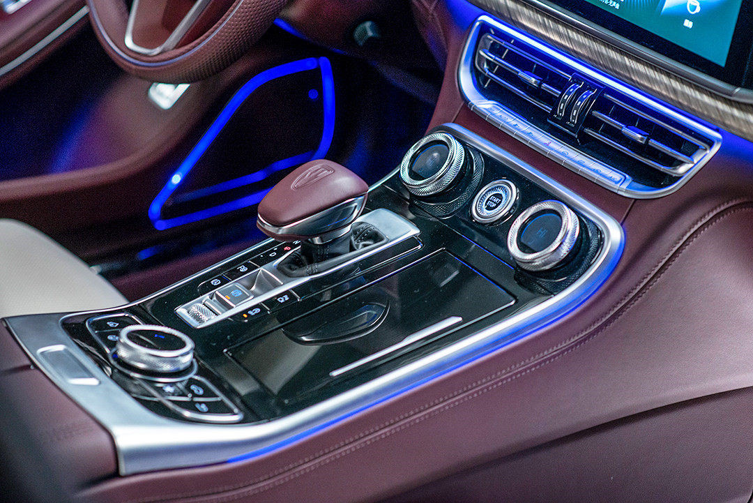 比如效仿劳斯莱斯帕特农神庙的威严格栅、比如龙胆紫搭配阿卡金、琥珀棕结合香槟金的高端配色、再比如与天安门城楼传统宫灯造型类似的竖排状尾灯,哪怕是车尾的红旗标字都是经过精心设计的。