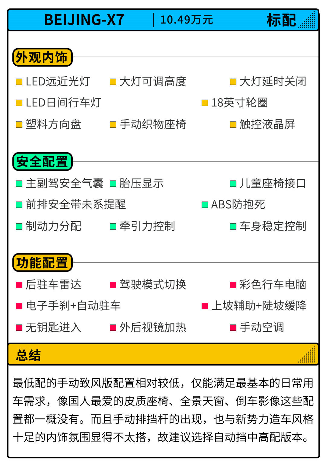 说实话,BEIJING-X7的总体价格在同级中并不算低,配置也不算特别高,综合考虑下,买买君给大家推荐次顶配的致潮版,舒适性和安全性配置相对齐全。