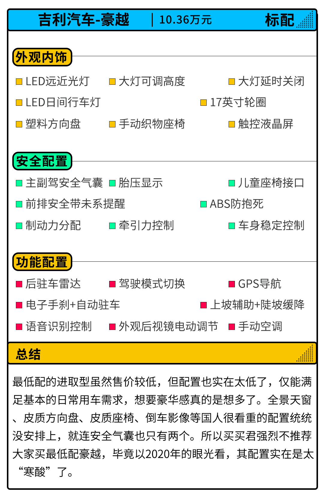 总的来说,豪越虽然价格较低、空间足够大,但要是仅凭这些就想对标汉兰达,那吉利还是太幼稚了,况且豪越长得还很像“面包车”,全系还不标配7座,光这两点在国内就是硬伤了。但是,如果你不介意豪越这个“四不像”的外观,并且对绝对大的空间有刚性需求,只是想买一台“皮薄馅儿又大”的简单大车,那豪越在同价位的自主品牌SUV中还是值得考虑的,但记住,千万别买最低配!