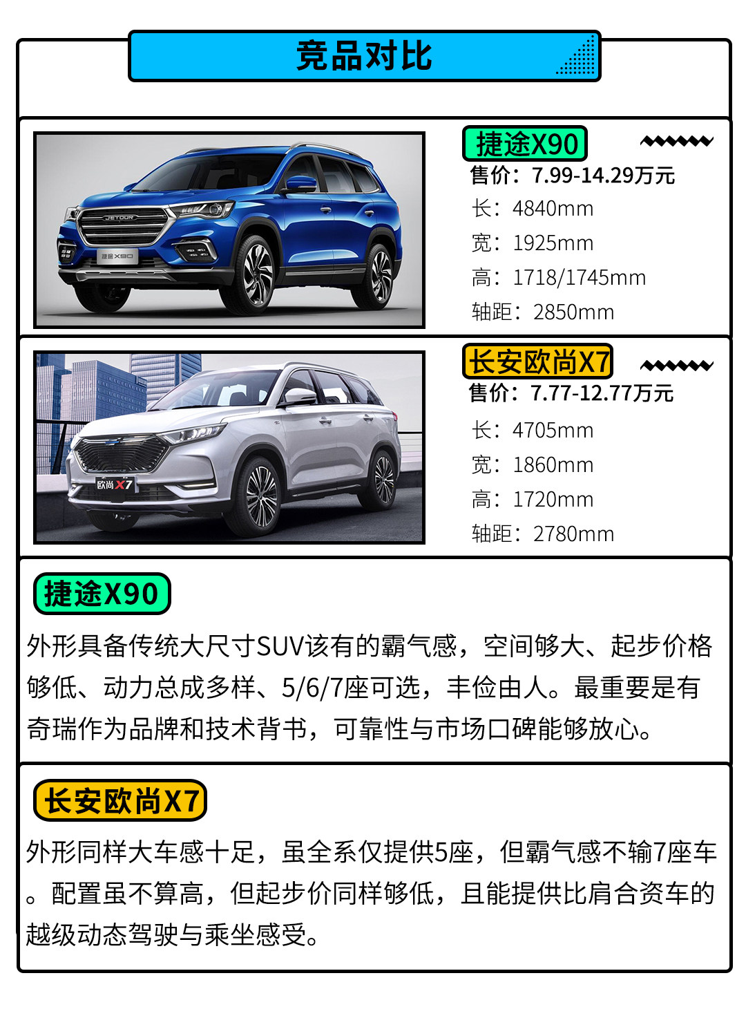 开头对比汉兰达开玩笑归开玩笑,若认真说,以豪越顶配14万不到的售价看,其真正的对手顶多是同为自主品牌的捷途X90、长安欧尚X7等这类主打低价大空间的入门价位中型SUV。