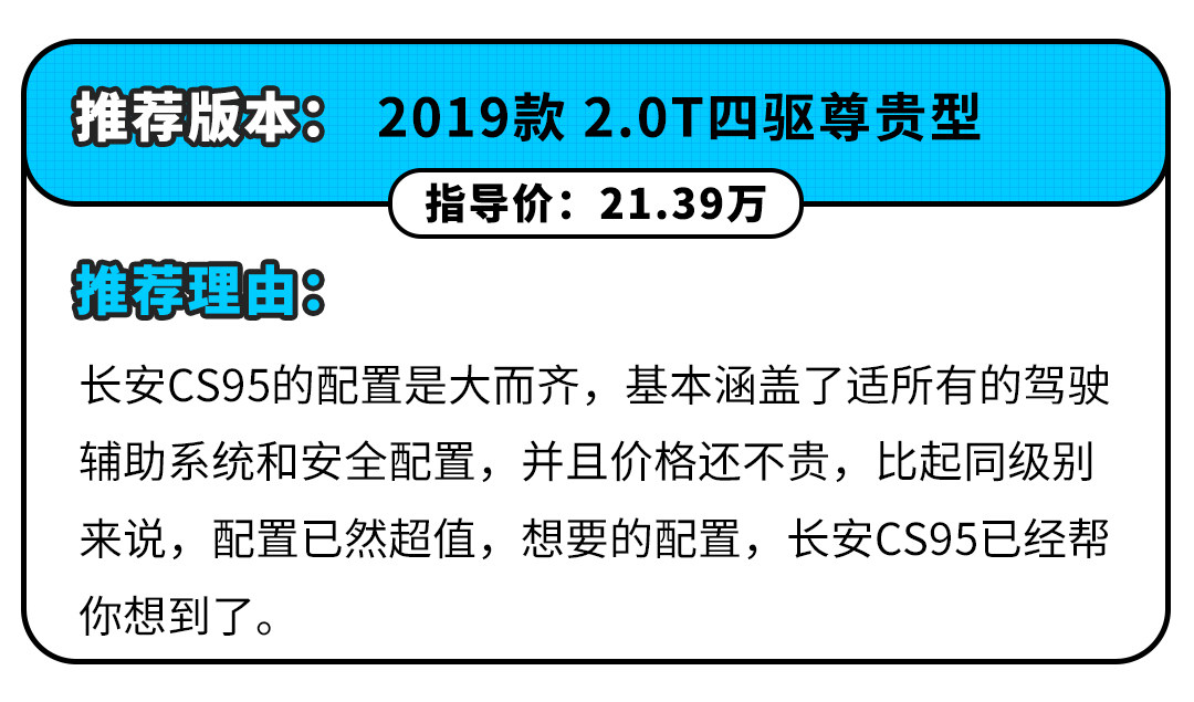 以此,长安汽车CS95除去市场终端优惠,其顶配车型裸车价不到20万元就可买到,就凭那套蓝鲸动力也值了。