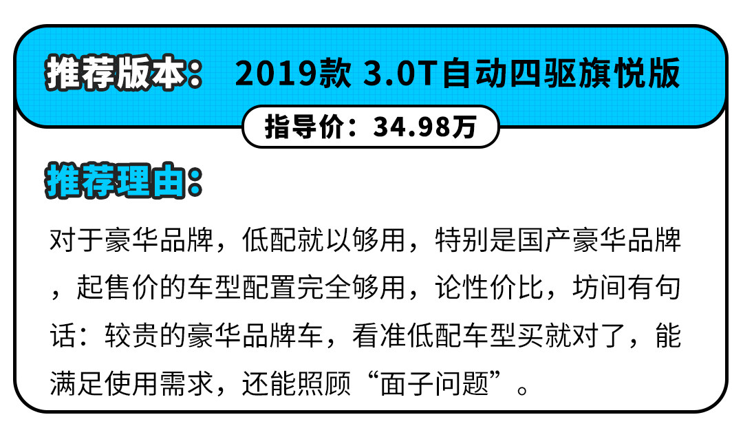以相同价格的豪华SUV作为对比,宝马X5和奔驰GLC只能去到中型SUV的尺寸,而且中低配车型基本配备是四缸机,而在高配车型配置的六缸机的价格则去到75万左右。