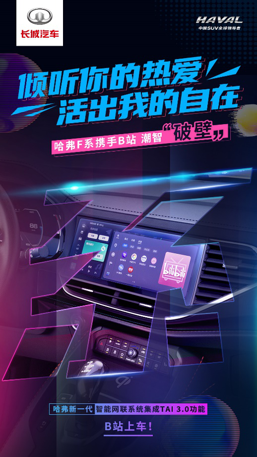 哈弗F系携手B站,不仅是积极拥抱“Z世代”的前沿之举,更有助哈弗F系以互联网思维打造更适合当下年轻人的潮智座驾。未来,用户在车上便可以随时欣赏B站的热门番剧、经典电影以及硬核UP主原创视频等优质内容。作为首批与B站进行合作的汽车品牌,相信哈弗将与B站一起持续打破次元壁,打造属于年轻人的智能AI座驾。