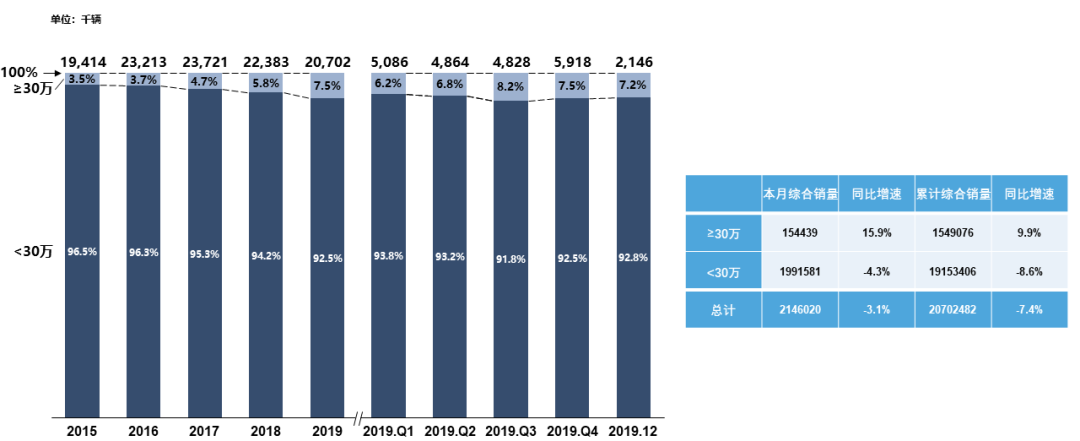 中大型SUV的价格基本都在30万元以上,而自主品牌的中大型SUV基本都在20万元左右,根据乘联会的同级数据,30万元以上的车型占比只有7.5%,虽然比例在逐渐增长,但依然很小众。