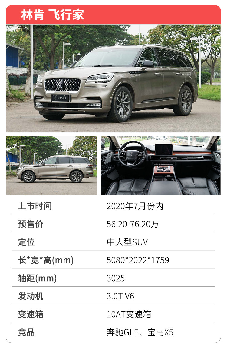 继冒险家之后,国产的飞行家也将要上市了,国产的它此次比BBA这类主流对手走得更前,也是外国品牌少有的50万级国产车型,顶配预售价就达到了76.20万。相比宝马X5、奔驰GLE以及奥迪Q7等进口车型,林肯飞行家不仅因为国产有着更低的价格,还具备更大的车身尺寸,车身尺寸达到了5080*2022*1759mm,轴距则是3025mm。更别说全系搭载3.0T V6发动机以及10AT变速箱,无论从品牌还是从性价比来说,这款美系豪华中大型SUV可谓是同级最佳!林肯作为一个后来者,却拥有豪华品牌中最大的魄力。