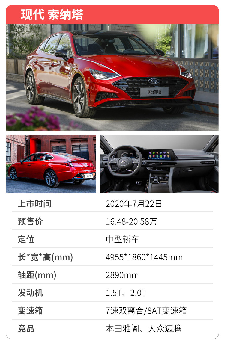终于,作为韩系代表之一的现代索纳塔要换代上市了,新车作为最新一代产品,采用了全新的“Sensuous Sportiness”,直译过来就是“感性运动”,整体造型不仅更运动,还更修长,车身尺寸为4955*1860*1445mm,轴距为2890mm,与一众对手相比优势颇大。另外还带有诸多科技配置,贯穿式双屏设计、电子挡板以及是最新的“智心合一”主动安全系统,再加上全新的1.5T发动机以及2.0T发动机,两者最大功率分别为170马力以及240马力,匹配7速双离合变速箱以及8AT变速箱。明显优于对手一筹的索纳塔,相信能成为韩系的崛起之作。