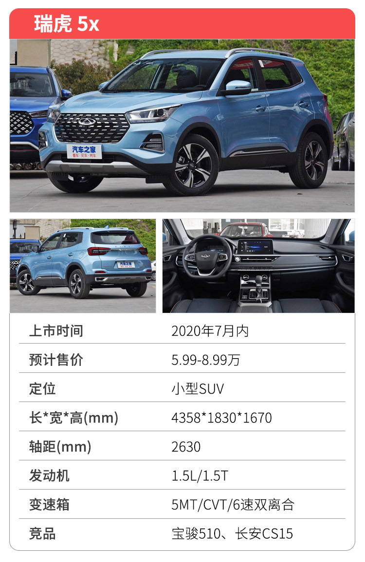 新车作为中期改款车型,设计以及配置进行相应的升级,进气格栅改成了新的点阵式设计,并且尺寸有所加大,整体观感更大气。内饰部分则进行重新设计,新增了全液晶仪表盘以及悬浮式中控屏幕,中部软质材料的加入让它有了几分豪华感。硬件参数方面,新车尺寸为4358*1830*1670mm,轴距为2630mm,搭载1.5L以及1.5T发动机,匹配5MT/CVT/6速双离合变速箱。但从视觉上看,颇为精致的瑞虎5x让你觉得这根本不像是一辆5.99万的SUV。