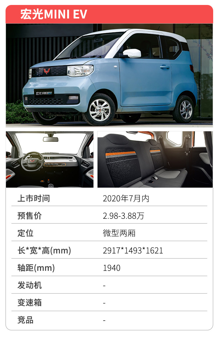 “人民需要什么,五菱就造什么”,在这种观念下宏光MINI EV出现了,新车定位纯电动微车,预售价只是2.98万起,而这款微型车虽然只有2917*1493*1621mm的车身尺寸,以及1940mm的轴距,但硬是塞进了一张后排座椅,让它可以成为一款同价位中绝无仅有的纯电动四座车型,非常的实用!动力方面,搭载20千瓦的电动机,最大扭矩85牛·米,NEDC续航根据配置不同分为120km以及170km,或许有人觉得它是老年代步车,但人民也确实需要这样亲民实用的“老年代步车”!