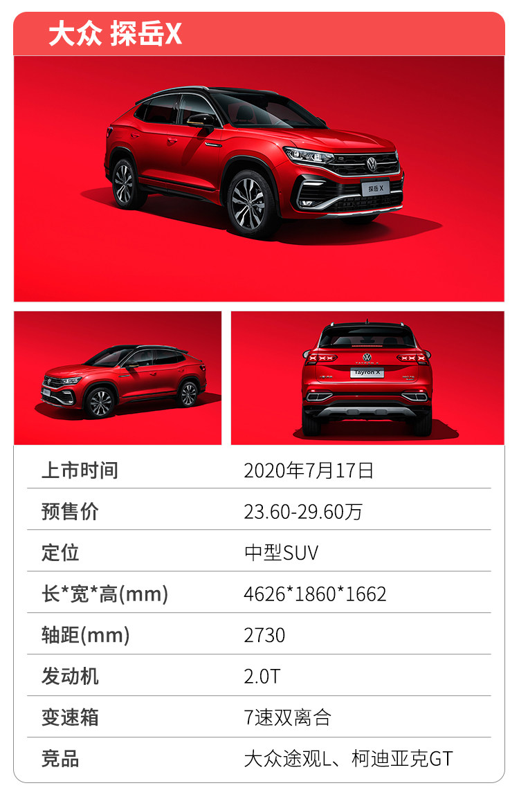 大众探岳已经成为了一汽-大众的最热销SUV,并且开始逐渐替代途观L的细分市场霸主地位。新增的探岳X,就是探岳的轿跑SUV车型,明显面对年轻人的它,尾部造型更动感,并且依然维持了探岳的大空间、低油耗属性。但作为与探岳的差异点,新车或许仅提供2.0T版本,高配车型搭载的是220马力的2.0T发动机,匹配7速双离合变速箱,并且带有4-Motion四驱系统。新车的出现,将扩张探岳系列的目标市场,巩固如今的销冠地位。非要说不足的话,教授希望它能尽快推出PHEV车型,满足某些限牌限行城市用户的需求。