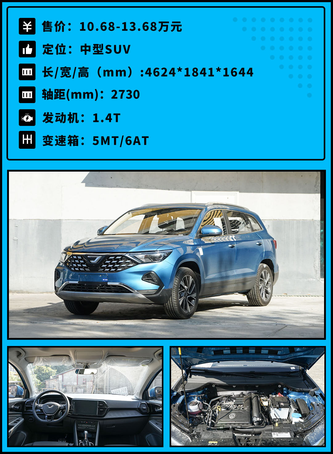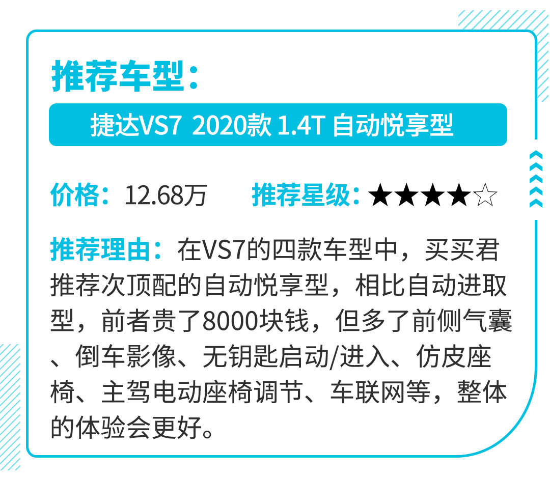 VS7是捷达家族第二款SUV,定位要高于VS5。VS7沿用了VS5的外观设计,采用了相同的MQB平台,搭载了相同的1.4T+6AT动力总成。