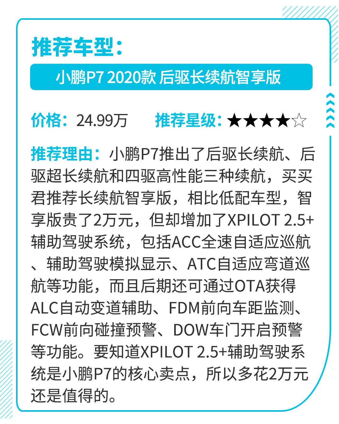 小鹏P7采用了星际系列设计语言,外观前卫不落伍,内饰的设计清爽而不失科技感,并且做工和用料也比Model 3更加厚道。除了时尚的外观和科幻的内饰之外,小鹏P7还拥有着4.3秒破百的加速成绩,而后驱超长续航版的NEDC综合续航达到了706km,从设计和配置来看,小鹏P7可谓不输Model 3。对于想要尝试国产高端电动车的朋友,小鹏P7可以尝试一下。