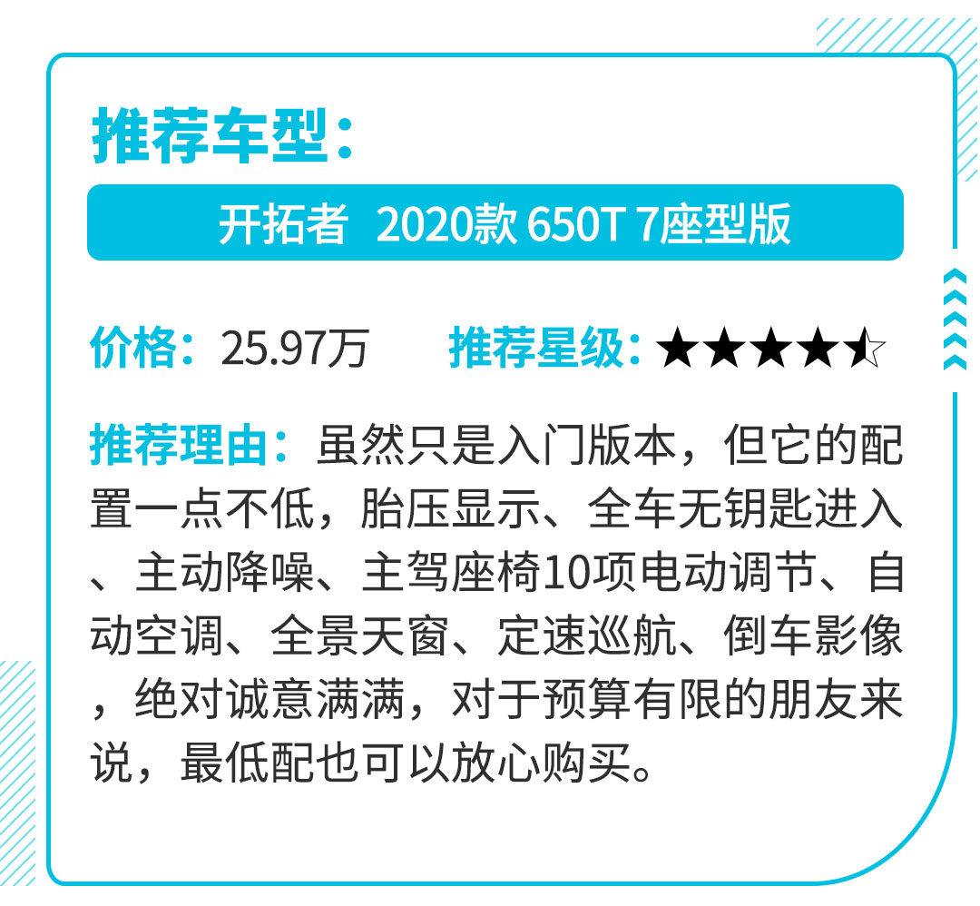 除了运动的外观外,配置也是开拓者的一大亮点,可谓入门级高配,而且动力也表现不错,2.0T直列四缸发动机,最大功率241马力,部分车型还提供四驱系统。如果你想要拥有一台年轻运动,但又要满足日常家用的7坐SUV,那么开拓者是个不错的选择。