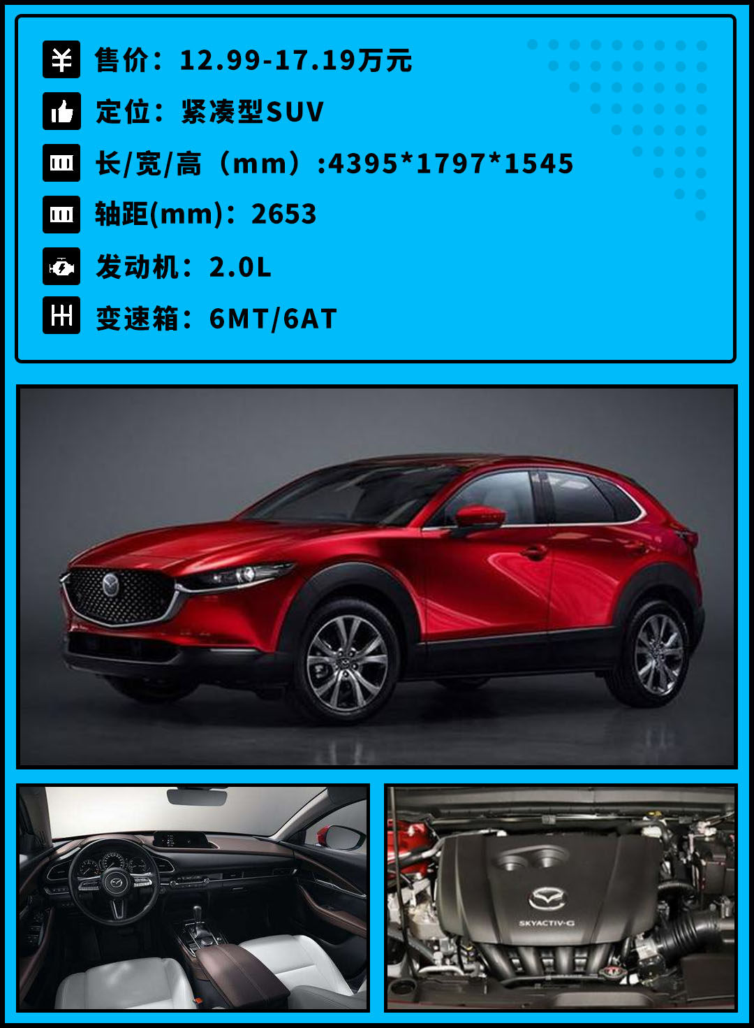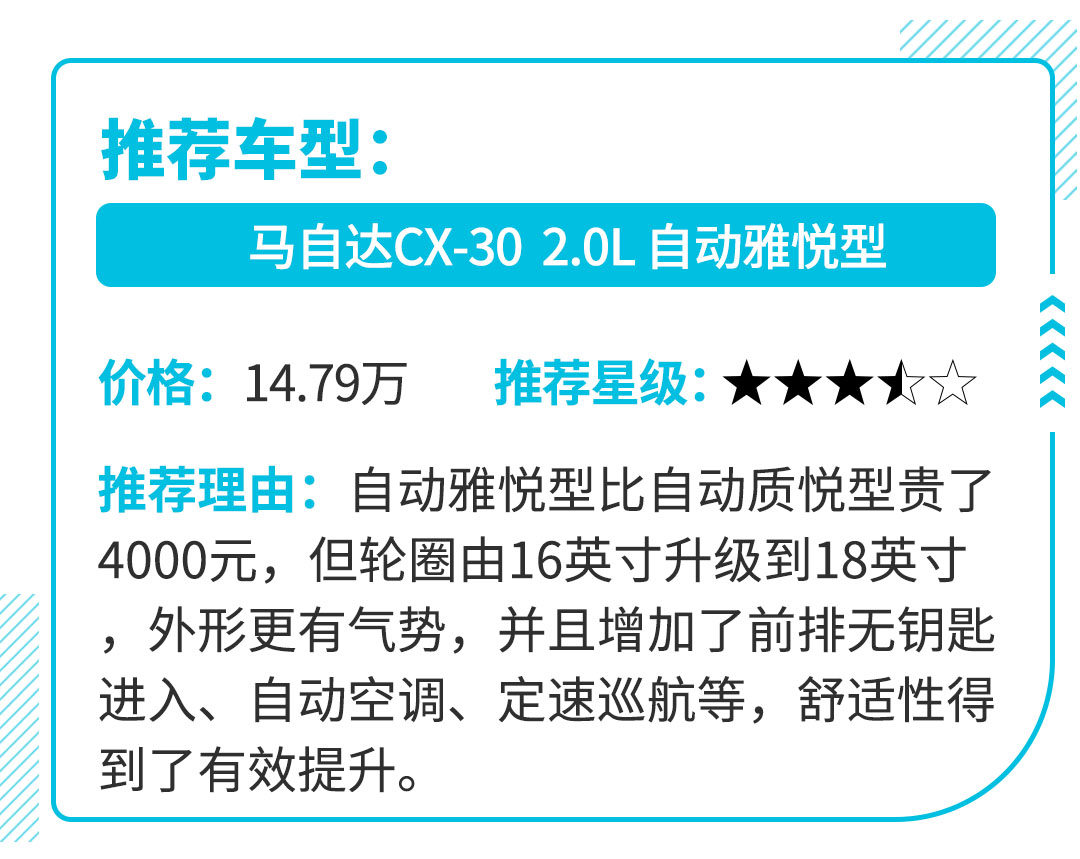 当然马自达的车型向来以设计见长,标志性的魂动红已然成为了街上一道亮丽的风景线,而CX-30也不例外,新车沿用了海外版的设计,魂动2.0设计理念集中体现了光影变幻和优雅曲线等,对于追求时尚运动的年轻消费者来说,CX-30是个不错的选择。如果你对新款马自达3两厢版念念不忘,那么CX-30也是一个不错的替代品,当然压燃发动机还得再等等。