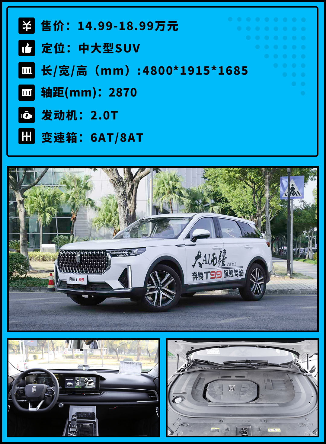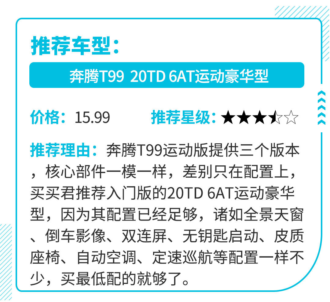 其实奔腾T99的底子并不差,可谓出身名门,与红旗HS5同平台打造,搭载了同款的CA4GC20TD-32 2.0T发动机,新上市的奔腾T99运动版采用爱信6AT替代了原来的那台盛瑞8AT,可靠性和响应速度都有了一定提升。追求性价比的朋友,可以关注下这款车型。