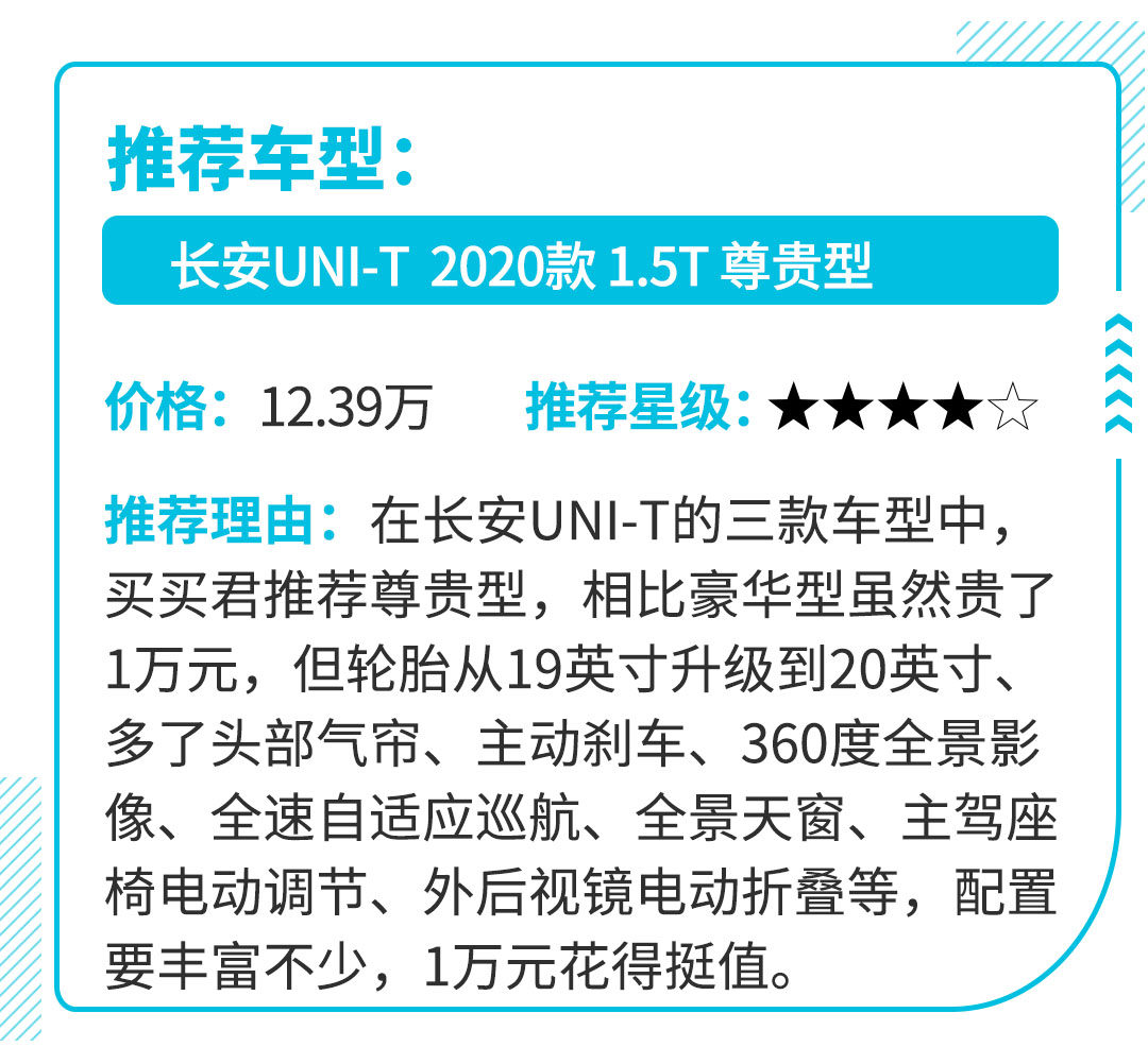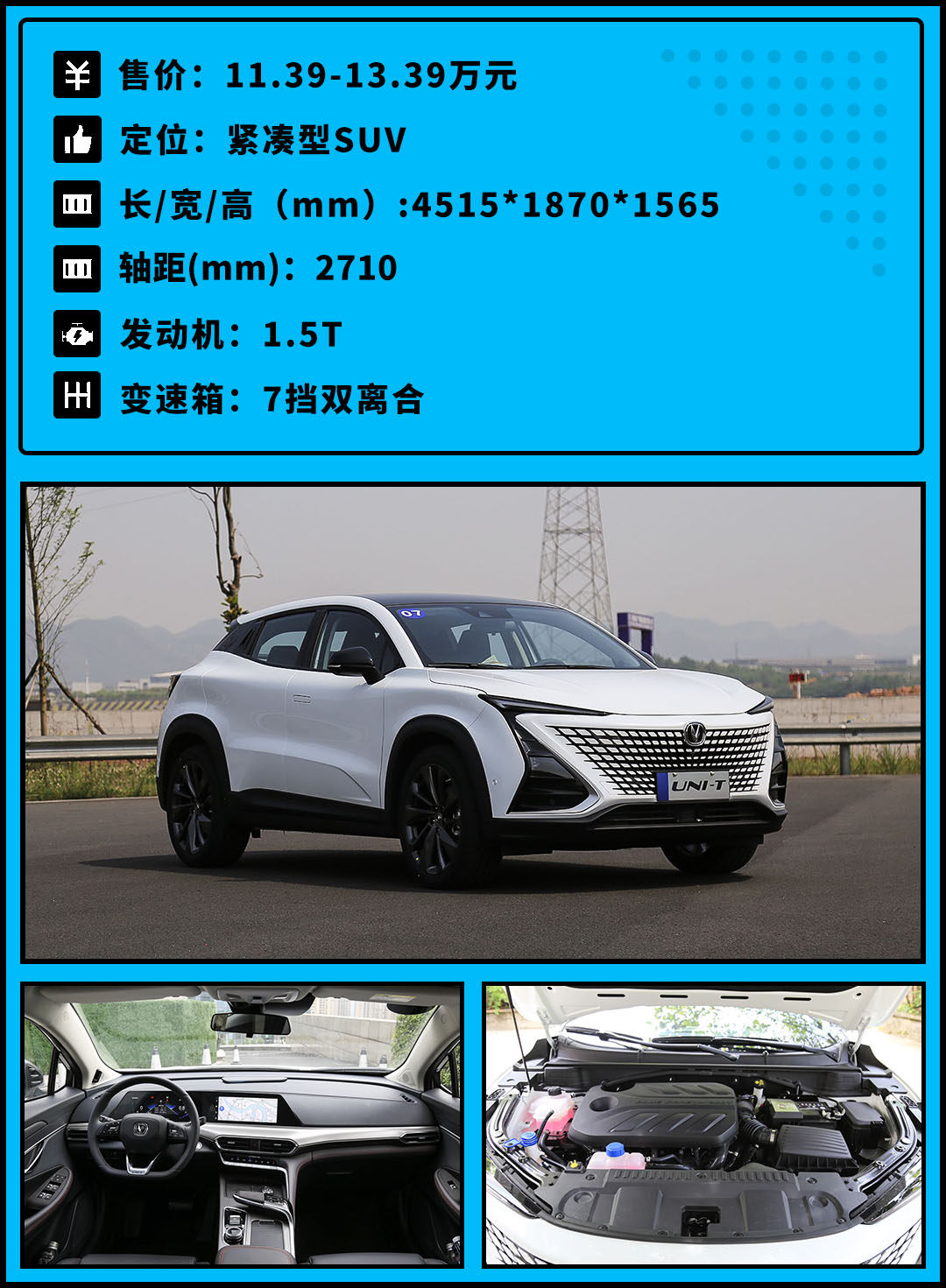 动力方面,UNI-T搭载了长安最新一代技术的蓝鲸NE1.5T直喷发动机,最大功率达到180马力,账面数据表现不错。匹配积极的7速双离合变速箱,百公里加速只要7秒多。对于追求运动、时髦的年轻朋友来说,UNI-T是个不容错过的产品。