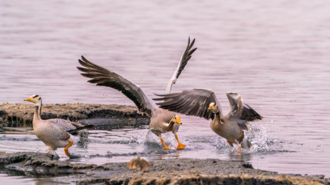 我们穿过湖面进入班德湖中心岛屿观测点,只需将红外线相机、远程视频监控等设备架于岛上,随后红外线相机用作当场数点数量,无人机则从上空拍照后,也通过照片来数点,最后以这两个数值为基准,通过相关算式计算得出班德湖斑头雁的最新数量。