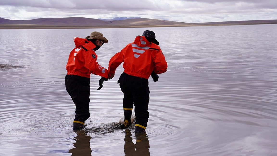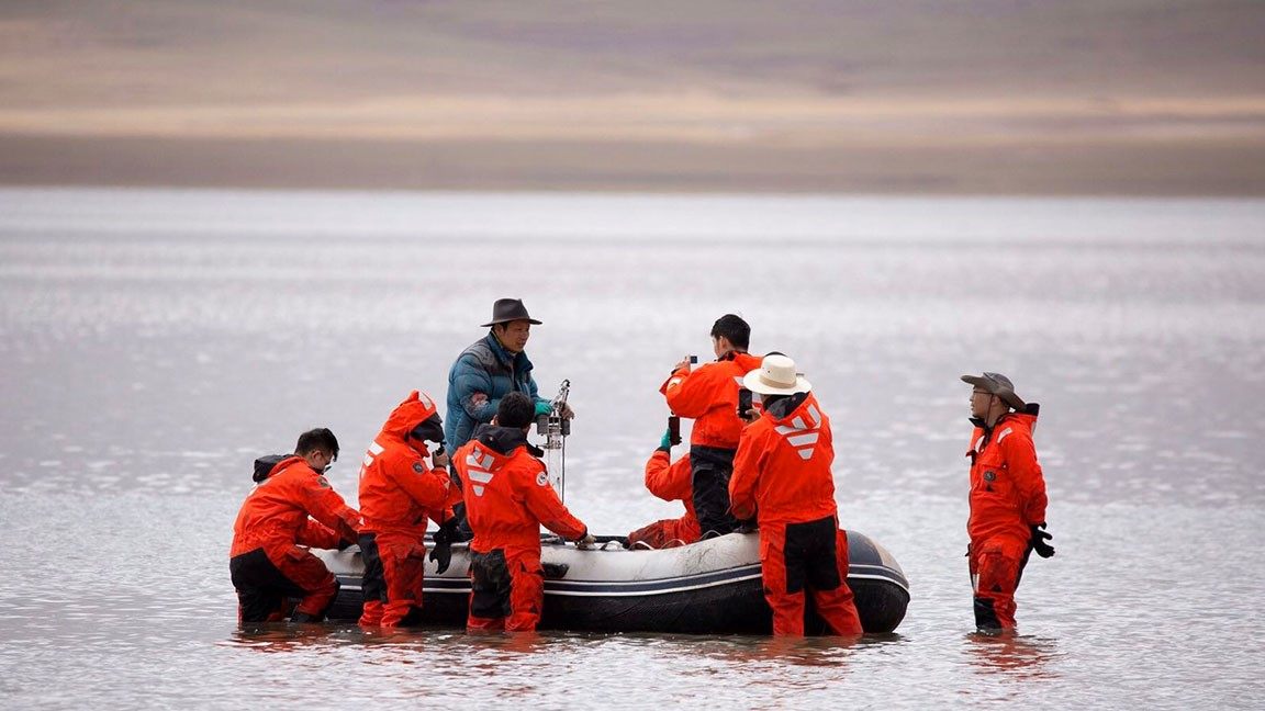 期间有一个小插曲,就是机动船的发动机用不上了,所以队员需要“人工发力”将船只推到湖的中心点。这简直就是对体力的考验,毕竟身处4500m海拔,氧气不充足,同时身上穿着价格不菲且很重的防水服,脚下踩着随时下陷的淤泥,寸步难行,全身乏力,就是最深的体会。但不得不再次感叹,科学家真的很伟大!