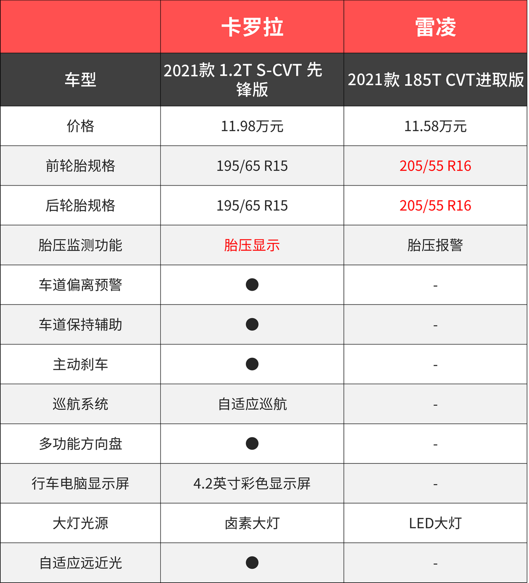 卡罗拉的入门版售价11.98万元,雷凌的入门版售价11.58万元。在这个价位差下,我个人更倾向卡罗拉的入门版。因为一套完整成熟的L2级自动驾驶辅助的价值远远不止4000块钱,且后期没有可能在外面加装。当然对于老司机来说,可能不需要L2驾驶辅助系统,那么雷凌更友好的后排配置以及灯光系统会更适合你。